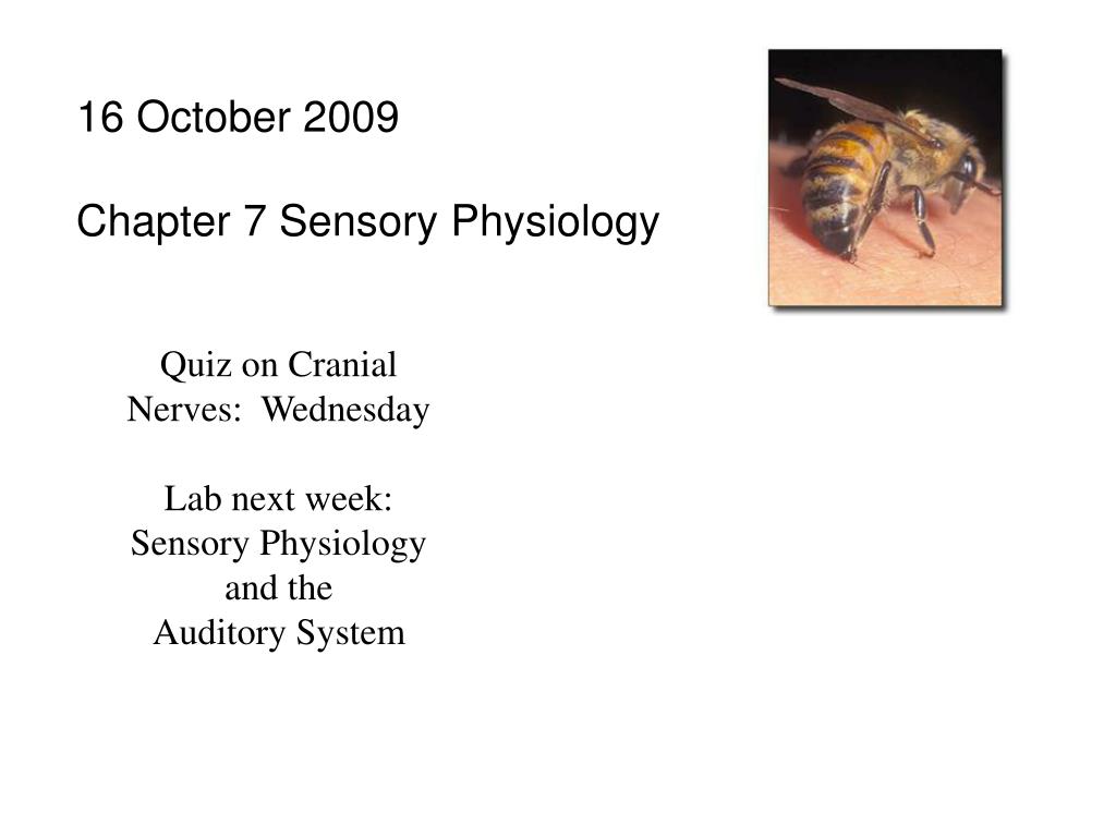 16 October 2009 Chapter 7 Sensory Physiology Quiz on Cranial Nerves: Wednesday Lab next week: Sensory Physiology and the Auditory System