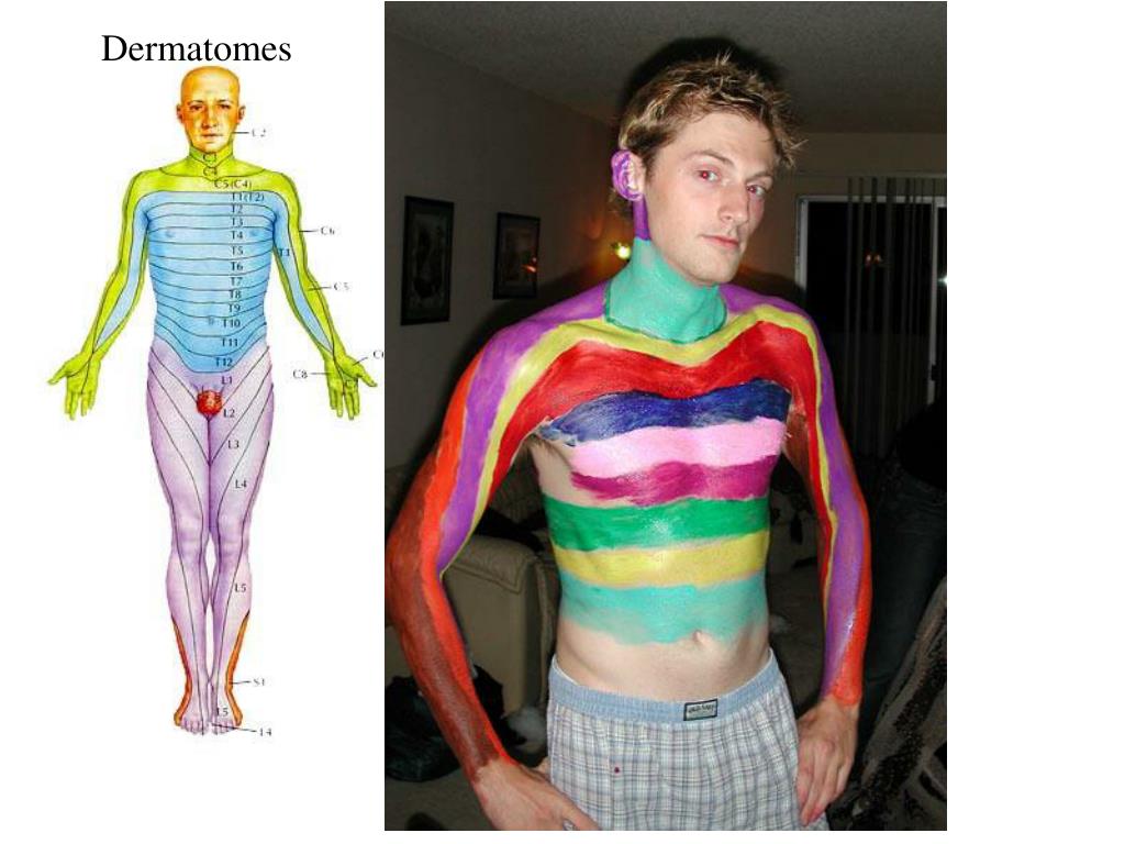 Figure 7.19 Right side Right side Anterolateral (spinothalamic) tract 1st order synapses onto 2nd order in spinal cord, 2nd order axon decussates in spinal cord, travels to thalamus in contralateral anterolateral tract, synpases onto 3rd order neuron in thalamus, which sends its axon to SSC. Dorsal column-medial lemniscal tract 1st order axons ascend in ipsilateral dorsal columns to synapses onto 2nd order in dorsal column nuclei of brainstem, 2nd order axon decussates in brainstem, travel to thalamus to synpases onto 3rd order neuron, which sends it axons to SSC. Right side Right side Proprioception