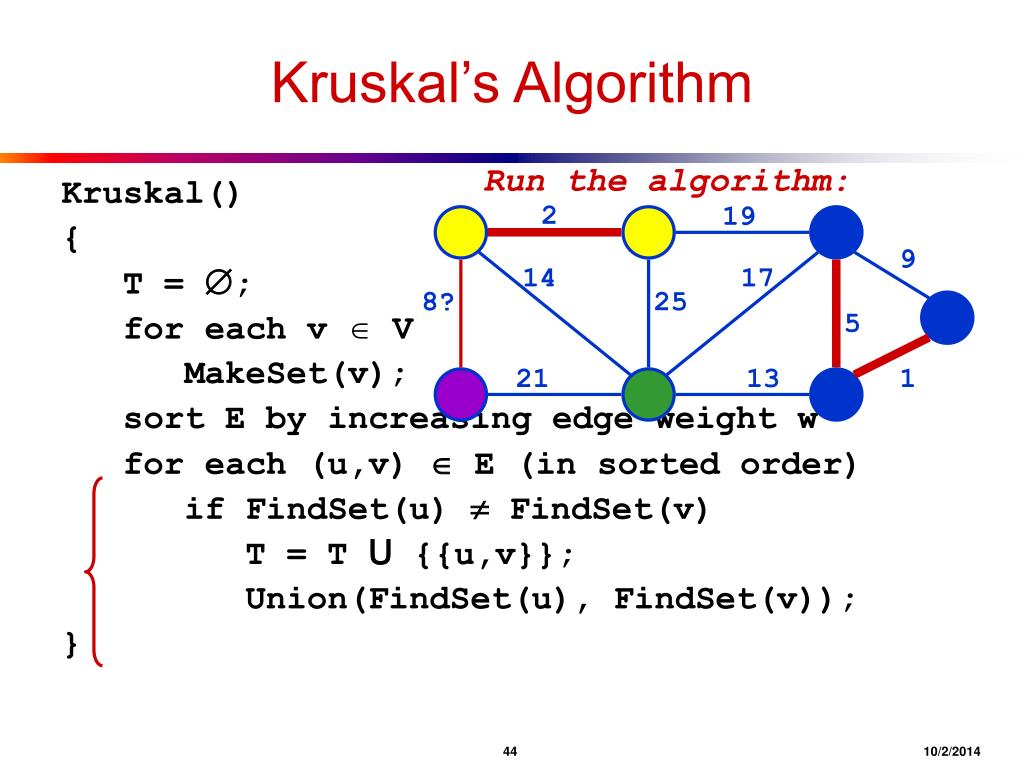 Kruskal’s Algorithm Run the algorithm: Kruskal() { T = ; for each v V MakeSet(v); sort E by increasing edge weight w for each (u,v) E (in sorted order) if FindSet(u) FindSet(v) T = T U {{u,v}}; Union(FindSet(u), FindSet(v)); } 2 19 9 14 17 8? 25 5 21 13 1 4410/2/2014