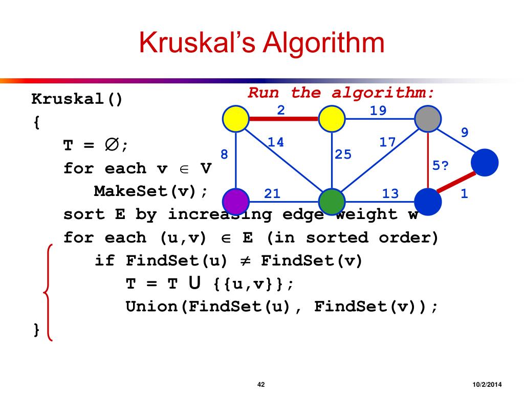 Kruskal’s Algorithm Run the algorithm: Kruskal() { T = ; for each v V MakeSet(v); sort E by increasing edge weight w for each (u,v) E (in sorted order) if FindSet(u) FindSet(v) T = T U {{u,v}}; Union(FindSet(u), FindSet(v)); } 2 19 9 14 17 8 25 5? 21 13 1 4210/2/2014