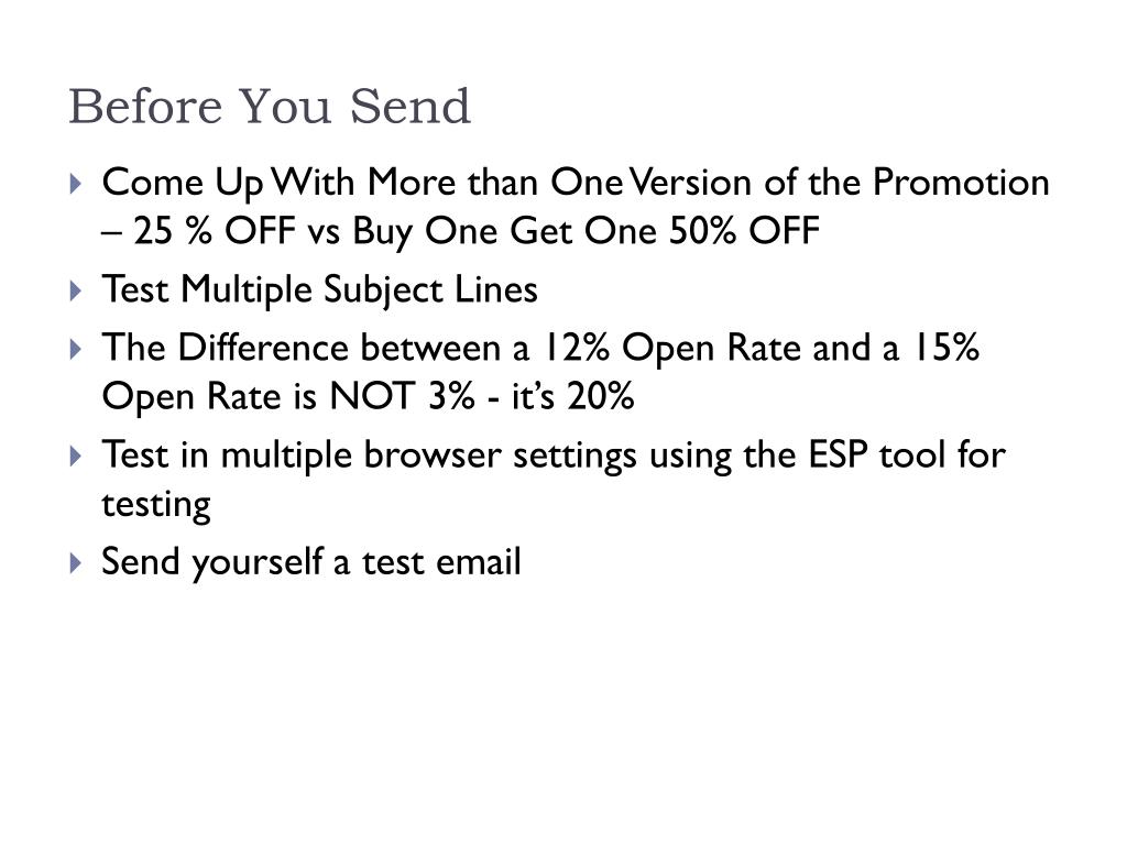 Before You Send • Come Up With More than One Version of the Promotion – 25 % OFF vs Buy One Get One 50% OFF • Test Multiple Subject Lines • The Difference between a 12% Open Rate and a 15% Open Rate is NOT 3% - it’s 20% • Test in multiple browser settings using the ESP tool for testing • Send yourself a test email