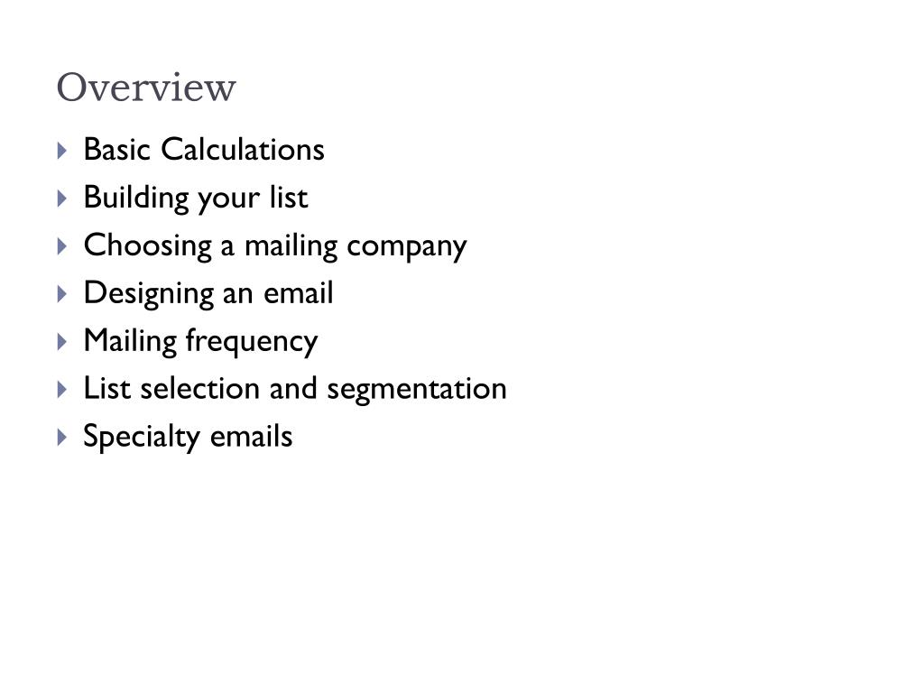Overview • Basic Calculations • Building your list • Choosing a mailing company • Designing an email • Mailing frequency • List selection and segmentation • Specialty emails