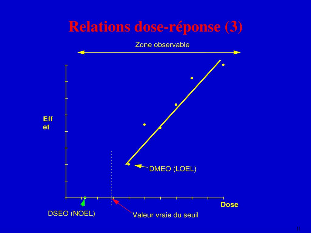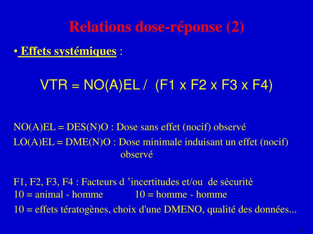 Relations dose-réponse (2) • Effets systémiques : • VTR = NO(A)EL / (F1 x F2 x F3 x F4) • NO(A)EL = DES(N)O : Dose sans effet (nocif) observé • LO(A)EL = DME(N)O : Dose minimale induisant un effet (nocif) observé • F1, F2, F3, F4 : Facteurs d ’incertitudes et/ou de sécurité • 10 = animal - homme 10 = homme - homme • 10 = effets tératogènes, choix d'une DMENO, qualité des données...