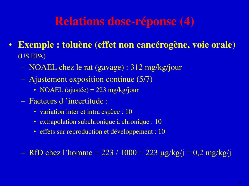 Relations dose-réponse (4) • Exemple : toluène (effet non cancérogène, voie orale) • (US EPA) • NOAEL chez le rat (gavage) : 312 mg/kg/jour • Ajustement exposition continue (5/7) • NOAEL (ajustée) = 223 mg/kg/jour • Facteurs d ’incertitude : • variation inter et intra espèce : 10 • extrapolation subchronique à chronique : 10 • effets sur reproduction et développement : 10 • RfD chez l’homme = 223 / 1000 = 223 µg/kg/j = 0,2 mg/kg/j
