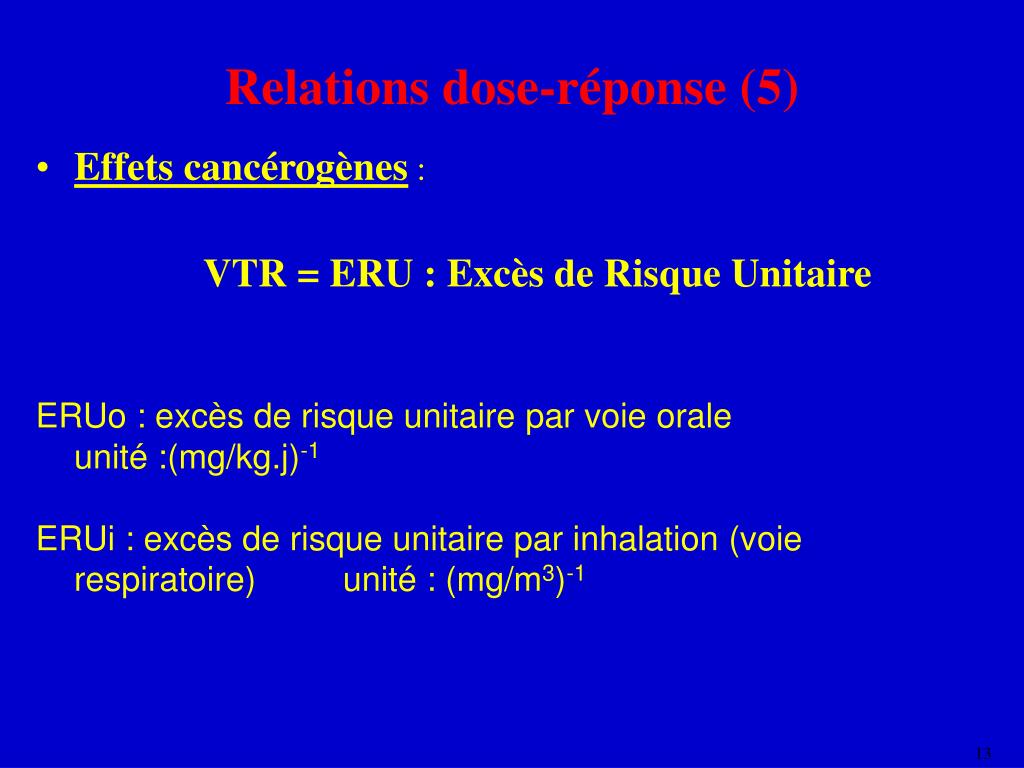 Relations dose-réponse (5) • Effets cancérogènes : • VTR = ERU : Excès de Risque Unitaire ERUo : excès de risque unitaire par voie orale unité :(mg/kg.j)-1 ERUi : excès de risque unitaire par inhalation (voie respiratoire) unité : (mg/m3)-1