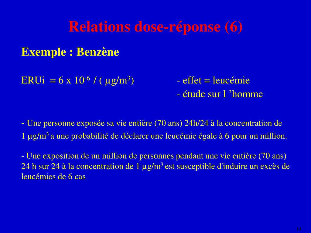 Relations dose-réponse (6) Exemple :Benzène ERUi = 6 x 10-6 / ( µg/m3) - effet = leucémie - étude sur l ’homme - Une personne exposée sa vie entière (70 ans) 24h/24 à la concentration de 1 µg/m3 a une probabilité de déclarer une leucémie égale à 6 pour un million. - Une exposition de un million de personnes pendant une vie entière (70 ans) 24 h sur 24 à la concentration de 1 µg/m3 est susceptible d'induire un excès de leucémies de 6 cas