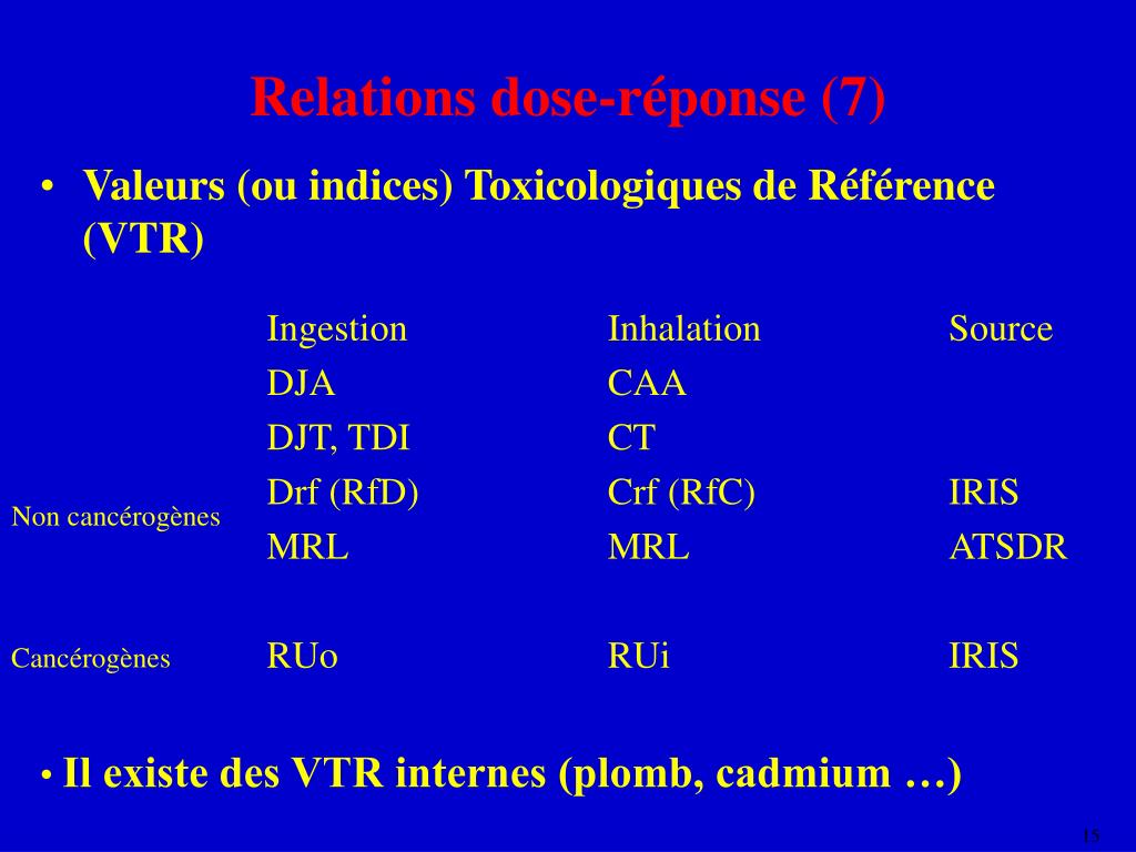Relations dose-réponse (7) • Valeurs (ou indices) Toxicologiques de Référence (VTR) • Ingestion Inhalation Source • DJA CAA • DJT, TDI CT • Drf (RfD) Crf (RfC) IRIS • MRL MRL ATSDR • RUo RUi IRIS Non cancérogènes Cancérogènes • Il existe des VTR internes (plomb, cadmium …)