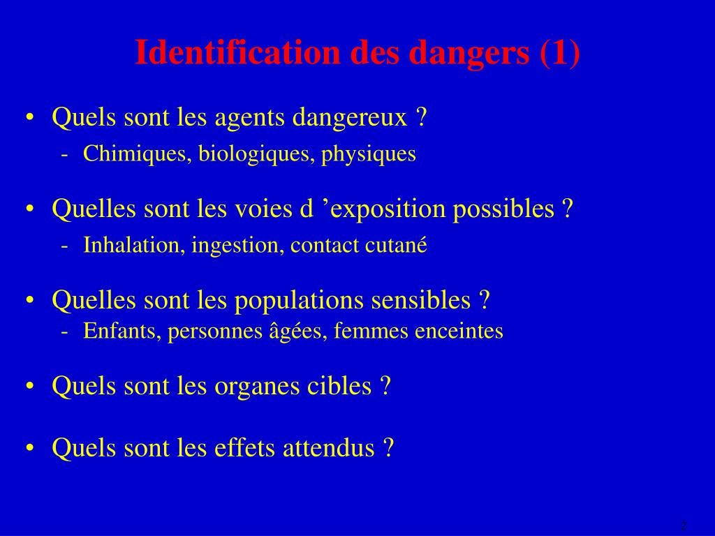 Identification des dangers (1) • Quels sont les agents dangereux ? • Chimiques, biologiques, physiques • Quelles sont les voies d ’exposition possibles ? • Inhalation, ingestion, contact cutané • Quelles sont les populations sensibles ? • Enfants, personnes âgées, femmes enceintes • Quels sont les organes cibles ? • Quels sont les effets attendus ?