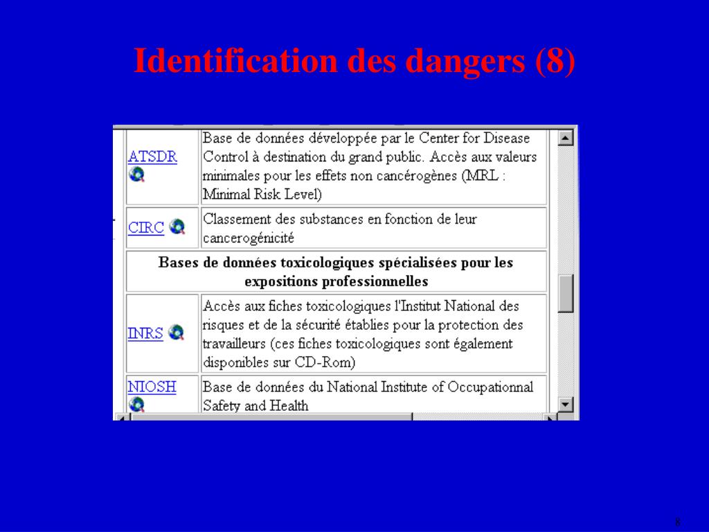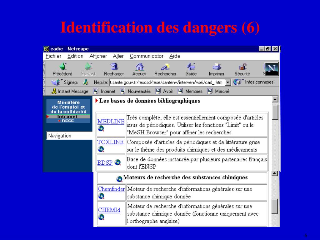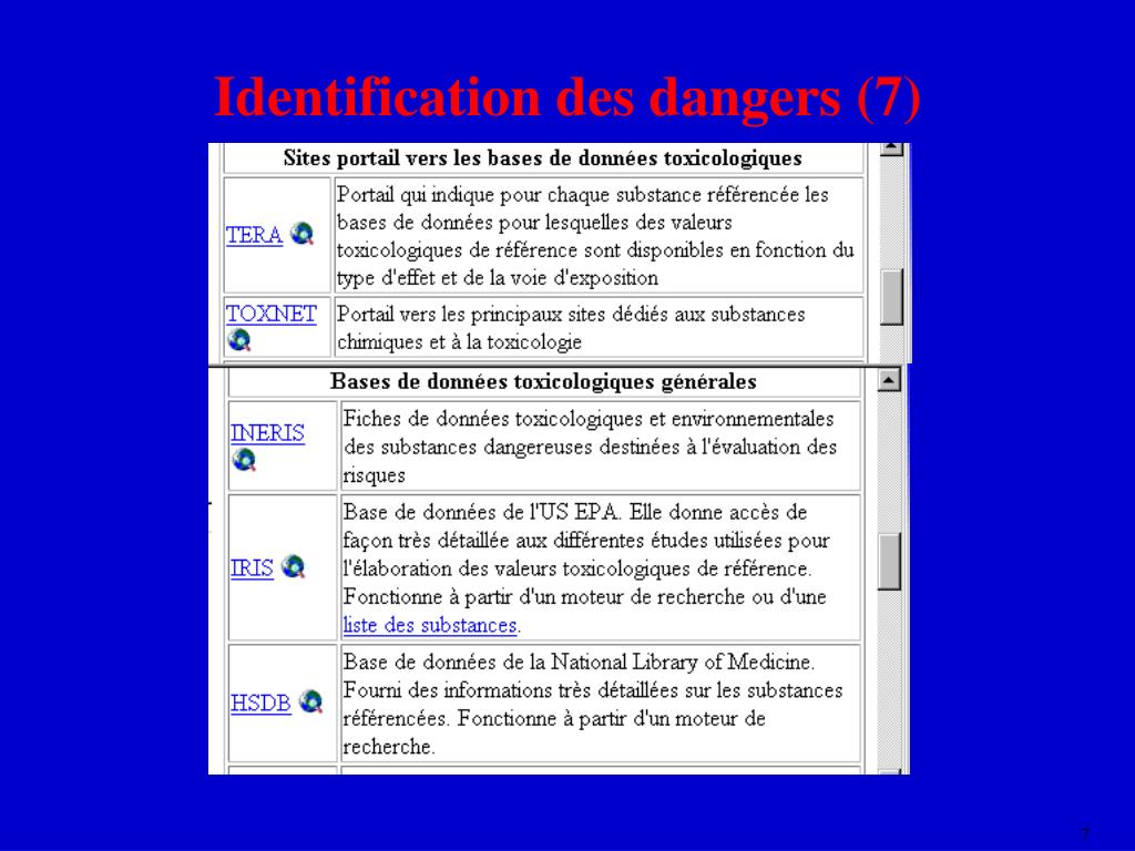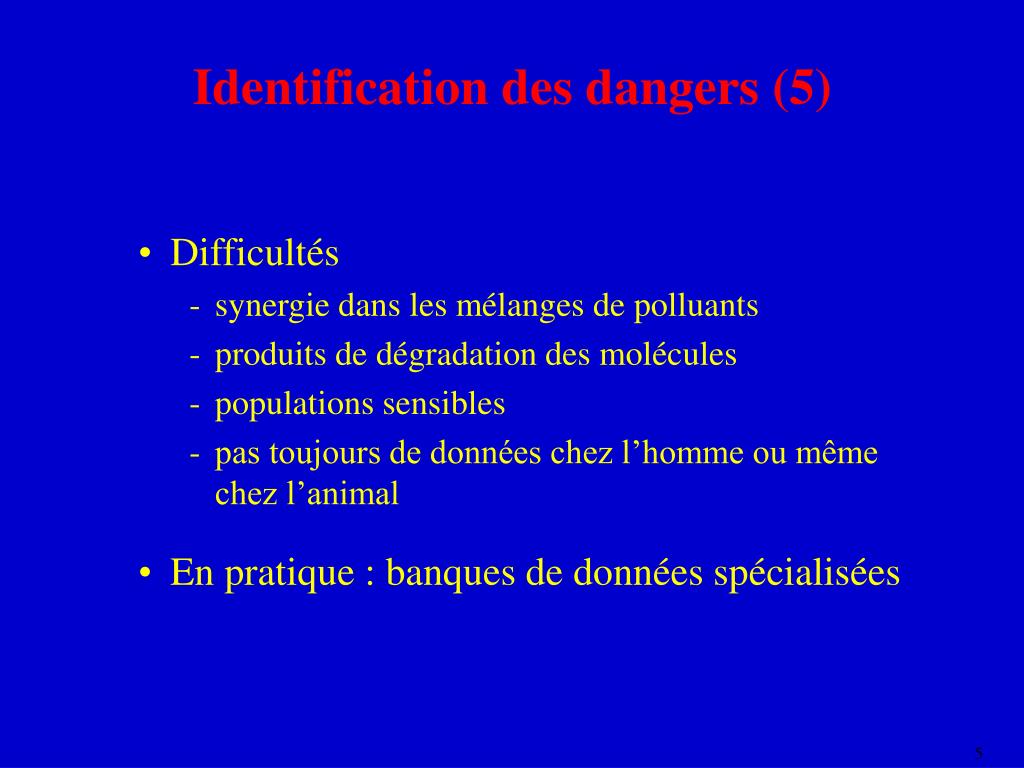 Identification des dangers (5) • Difficultés • synergie dans les mélanges de polluants • produits de dégradation des molécules • populations sensibles • pas toujours de données chez l’homme ou même chez l’animal • En pratique : banques de données spécialisées