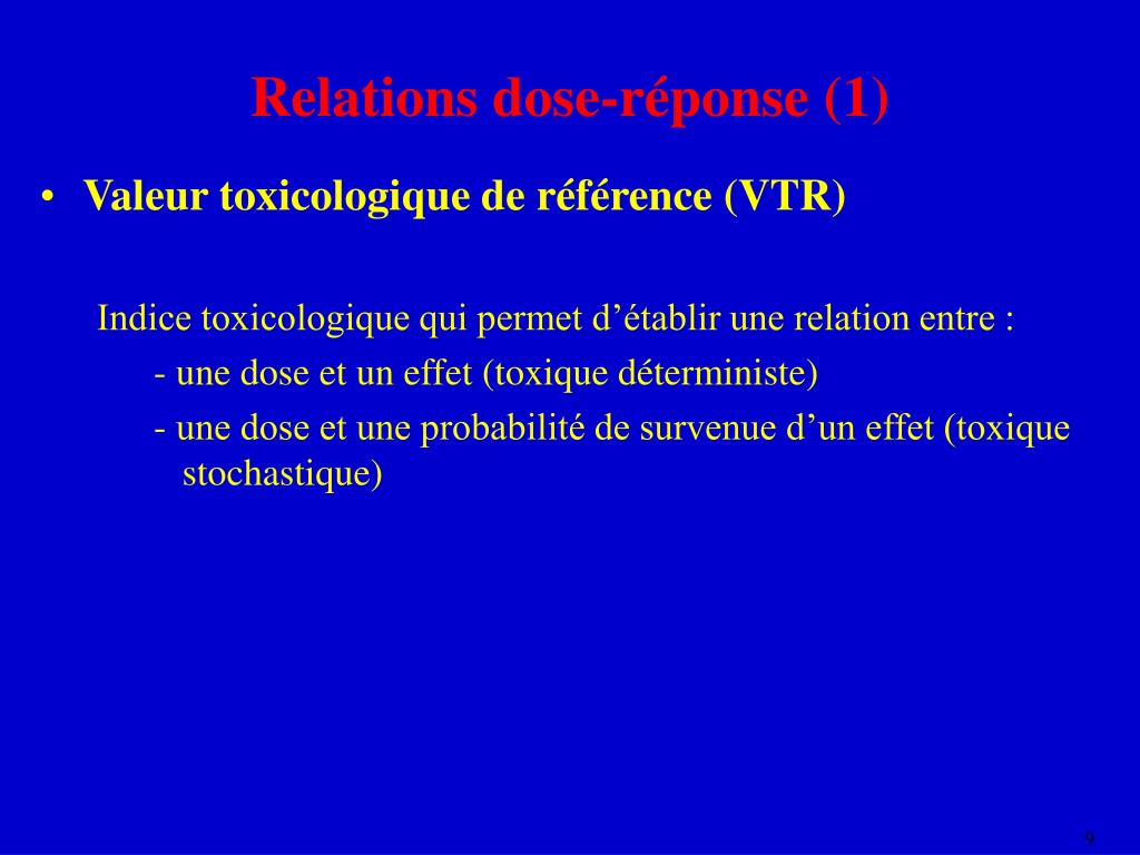 Relations dose-réponse (1) • Valeur toxicologique de référence (VTR) • Indice toxicologique qui permet d’établir une relation entre : • - une dose et un effet (toxique déterministe) • - une dose et une probabilité de survenue d’un effet (toxique stochastique)