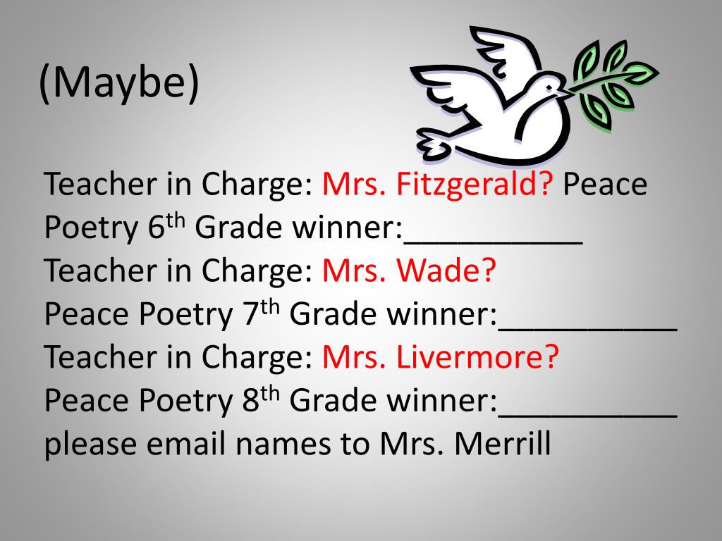 Teacher in Charge: Mrs. Fitzgerald? Peace Poetry 6th Grade winner:__________Teacher in Charge: Mrs. Wade? Peace Poetry 7th Grade winner:__________Teacher in Charge: Mrs. Livermore? Peace Poetry 8th Grade winner:__________please email names to Mrs. Merrill (Maybe)