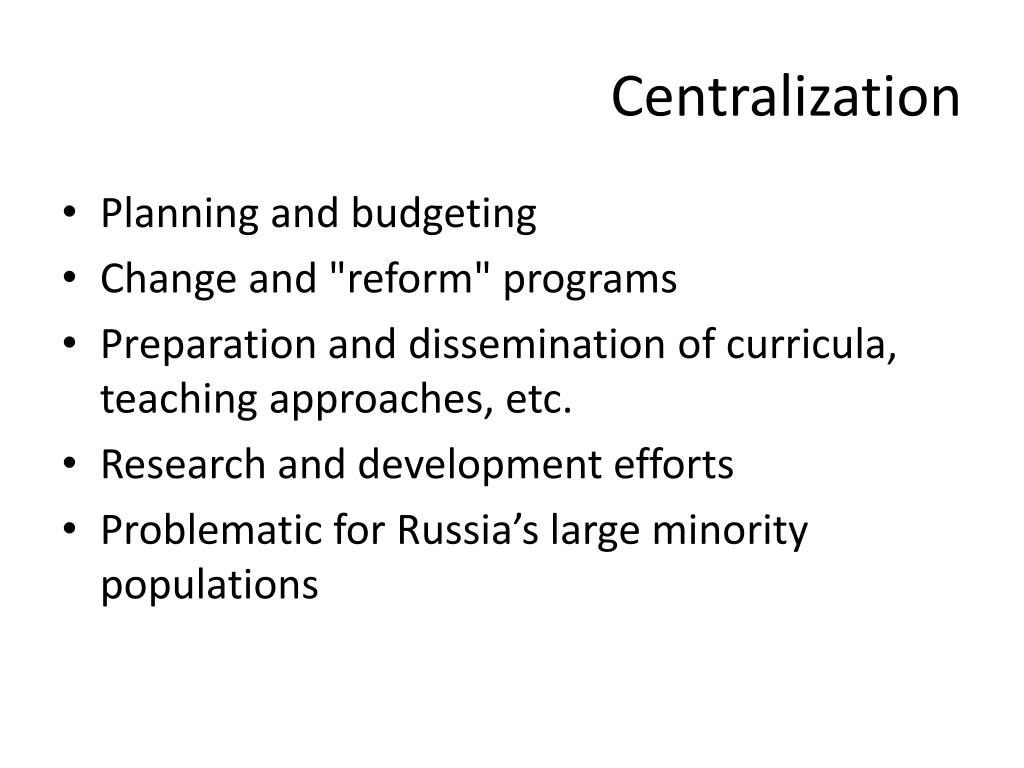 Centralization • Planning and budgeting • Change and "reform" programs • Preparation and dissemination of curricula, teaching approaches, etc. • Research and development efforts • Problematic for Russia’s large minority populations