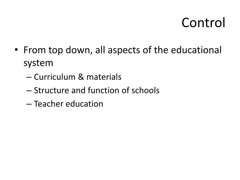 Control • From top down, all aspects of the educational system • Curriculum & materials • Structure and function of schools • Teacher education