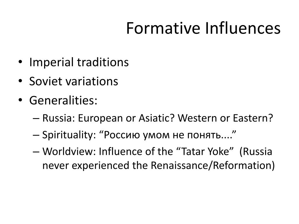 Formative Influences • Imperial traditions • Soviet variations • Generalities: • Russia: European or Asiatic? Western or Eastern? • Spirituality: “Россию умом не понять....” • Worldview: Influence of the “Tatar Yoke” (Russia never experienced the Renaissance/Reformation)