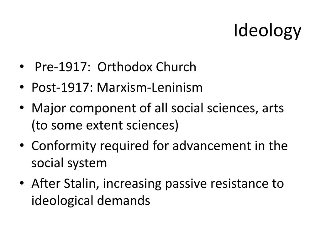 Ideology • Pre-1917: Orthodox Church • Post-1917: Marxism-Leninism • Major component of all social sciences, arts (to some extent sciences) • Conformity required for advancement in the social system • After Stalin, increasing passive resistance to ideological demands