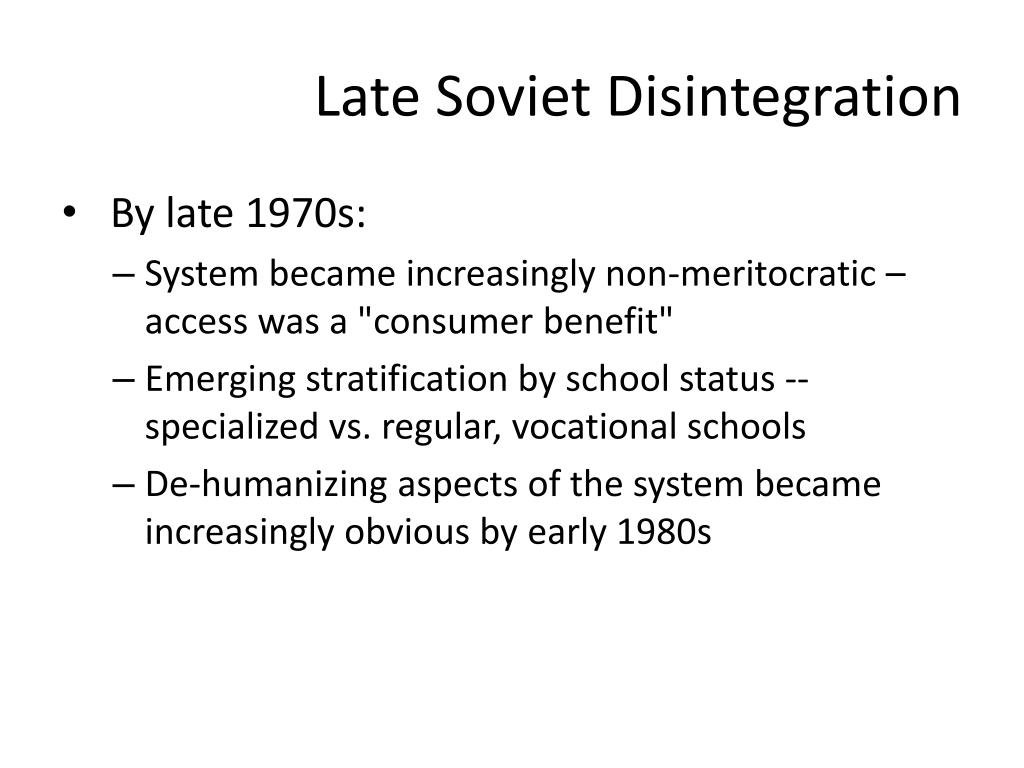 Late Soviet Disintegration • By late 1970s: • System became increasingly non-meritocratic – access was a "consumer benefit" • Emerging stratification by school status -- specialized vs. regular, vocational schools • De-humanizing aspects of the system became increasingly obvious by early 1980s