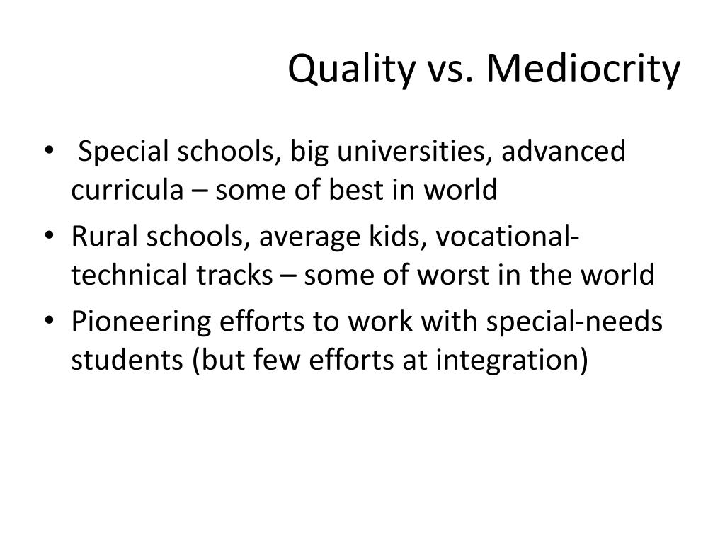 Quality vs. Mediocrity • Special schools, big universities, advanced curricula – some of best in world • Rural schools, average kids, vocational-technical tracks – some of worst in the world • Pioneering efforts to work with special-needs students (but few efforts at integration)