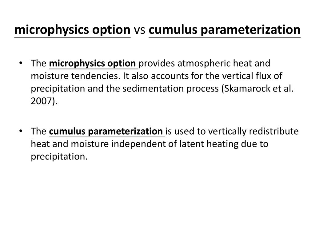 microphysics optionvscumulus parameterization • The microphysics option providesatmospheric heat and moisture tendencies. It also accountsfor the vertical flux of precipitation and thesedimentation process (Skamarock et al. 2007). • The cumulus parameterizationis used to vertically redistribute heat and moisture independentof latent heating due to precipitation.