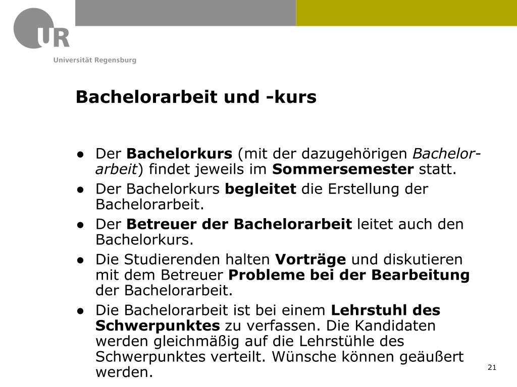 Bachelorarbeit und -kurs • Der Bachelorkurs (mit der dazugehörigen Bachelor-arbeit) findet jeweils im Sommersemester statt. • Der Bachelorkurs begleitet die Erstellung der Bachelorarbeit. • Der Betreuer der Bachelorarbeit leitet auch den Bachelorkurs. • Die Studierenden halten Vorträge und diskutieren mit dem Betreuer Probleme bei der Bearbeitung der Bachelorarbeit. • Die Bachelorarbeit ist bei einem Lehrstuhl des Schwerpunktes zu verfassen. Die Kandidaten werden gleichmäßig auf die Lehrstühle des Schwerpunktes verteilt. Wünsche können geäußert werden. 21