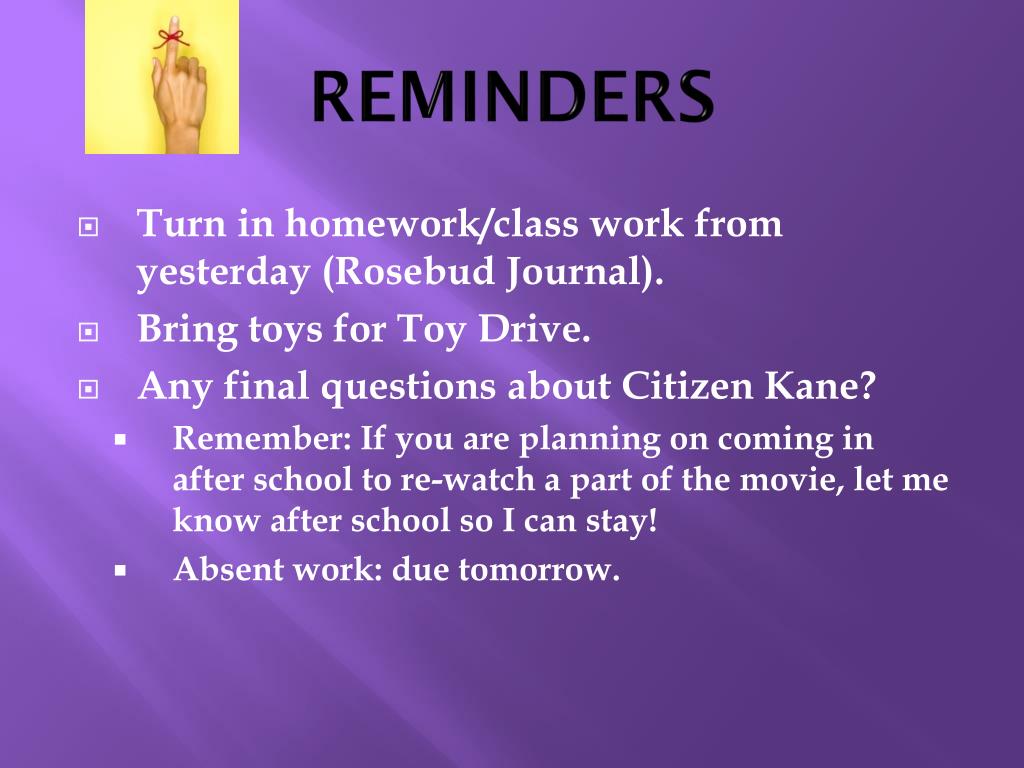 REMINDERS • Turn in homework/class work from yesterday (Rosebud Journal). • Bring toys for Toy Drive. • Any final questions about Citizen Kane? • Remember: If you are planning on coming in after school to re-watch a part of the movie, let me know after school so I can stay! • Absent work: due tomorrow.
