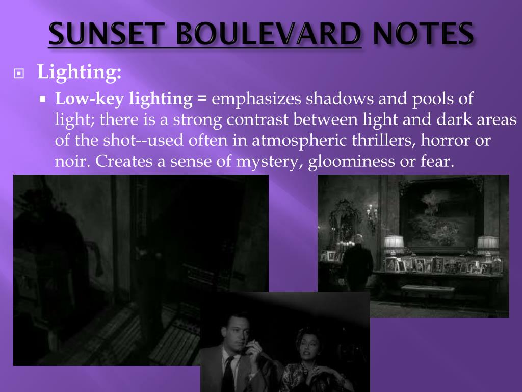 SUNSET BOULEVARD NOTES • Lighting: • Low-key lighting = emphasizes shadows and pools of light; there is a strong contrast between light and dark areas of the shot--used often in atmospheric thrillers, horror or noir. Creates a sense of mystery, gloominess or fear.