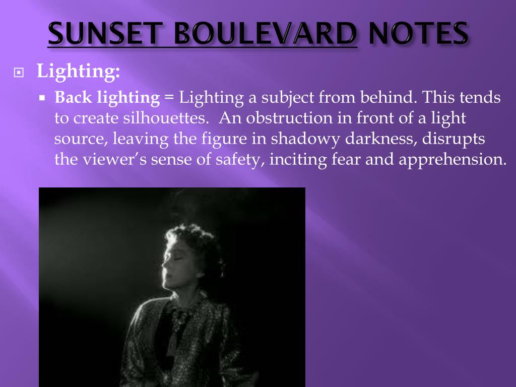 SUNSET BOULEVARD NOTES • Lighting: • Back lighting = Lighting a subject from behind. This tends to create silhouettes. An obstruction in front of a light source, leaving the figure in shadowy darkness, disrupts the viewer’s sense of safety, inciting fear and apprehension.