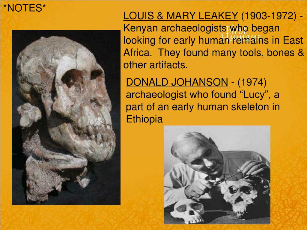 *NOTES* LOUIS & MARY LEAKEY (1903-1972) - Kenyan archaeologists who began looking for early human remains in East Africa. They found many tools, bones & other artifacts. DONALD JOHANSON - (1974) archaeologist who found “Lucy”, a part of an early human skeleton in Ethiopia