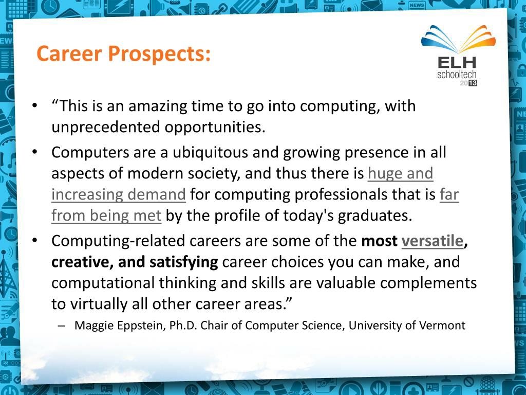 “This is an amazing time to go into computing, with unprecedented opportunities. Computers are a ubiquitous and growing presence in all aspects of modern society, and thus there is huge and increasing demand for computing professionals that is far from being met by the profile of today's graduates. Computing-related careers are some of the most versatile, creative, and satisfying career choices you can make, and computational thinking and skills are valuable complements to virtually all other career areas.” • Maggie Eppstein, Ph.D. Chair of Computer Science, University of Vermont Career Prospects: