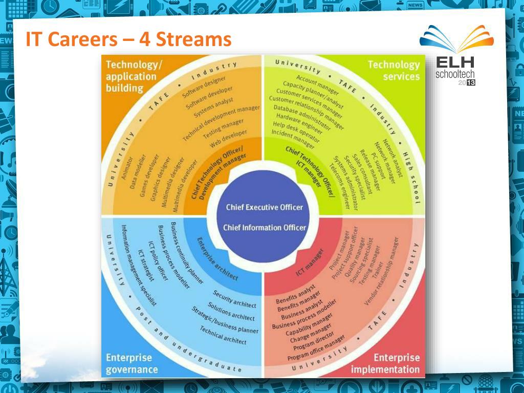 One of the two Technology subjects are core to end of Yr 8 Optional at Year 9 &10 ICT for users (embedded/integrated) Digital Technology – for creators/developers Only 4% of curriculum time wise – same as Geography! Application of computational thinking &use of information systems as well as critical thinking skills. May include some online cyber-safety ACARA Digital Technologies