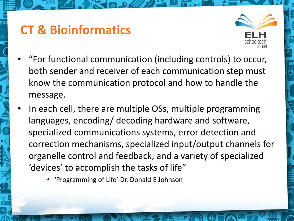 “For functional communication (including controls) to occur, both sender and receiver of each communication step must know the communication protocol and how to handle the message. In each cell, there are multiple OSs, multiple programming languages, encoding/ decoding hardware and software, specialized communications systems, error detection and correction mechanisms, specialized input/output channels for organelle control and feedback, and a variety of specialized ‘devices’ to accomplish the tasks of life” • ‘Programming of Life’ Dr. Donald E Johnson CT & Bioinformatics