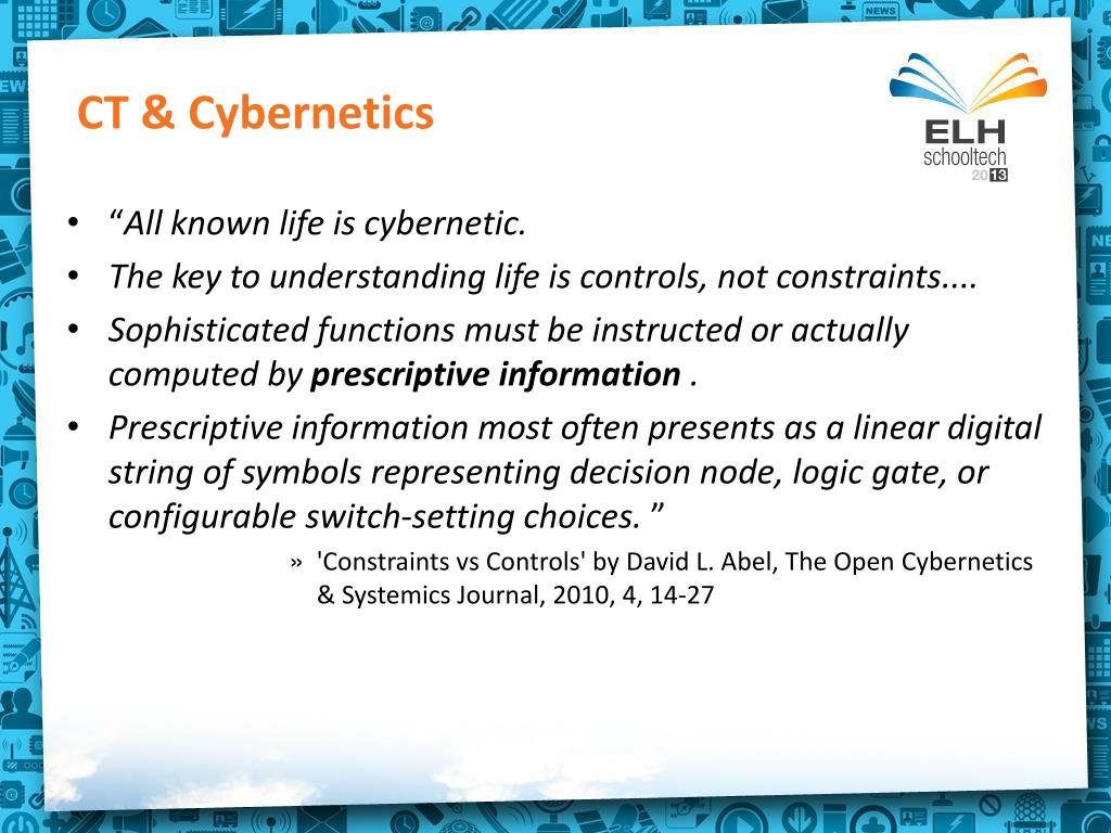“All known life is cybernetic. The key to understanding life is controls, not constraints.... Sophisticated functions must be instructed or actually computed by prescriptive information . Prescriptive informationmost often presents as a linear digital string of symbols representing decision node, logic gate, or configurable switch-setting choices. ” • 'Constraints vs Controls' by David L. Abel, The Open Cybernetics & Systemics Journal, 2010, 4, 14-27 CT & Cybernetics