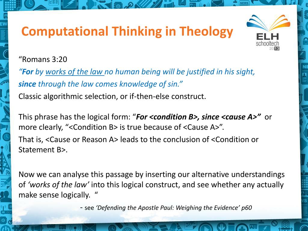 “Romans 3:20 “For by works of the law no human being will be justified in his sight, since through the law comes knowledge of sin.” Classic algorithmic selection, or if-then-else construct. This phrase has the logical form:“For <condition B>, since <cause A>” or more clearly, “<Condition B> is true because of <Cause A>”. That is, <Cause or Reason A> leads to the conclusion of <Condition or Statement B>. Now we can analyse this passage by inserting our alternative understandings of ‘works of the law’ into this logical construct, and see whether any actually make senselogically. “ - see ‘Defending the Apostle Paul: Weighing the Evidence’ p60 Computational Thinking in Theology