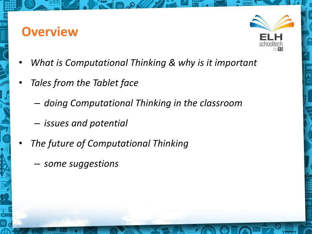 What is Computational Thinking & why is it important Tales from the Tablet face • doing Computational Thinking in the classroom • issues and potential The future of Computational Thinking • some suggestions Overview