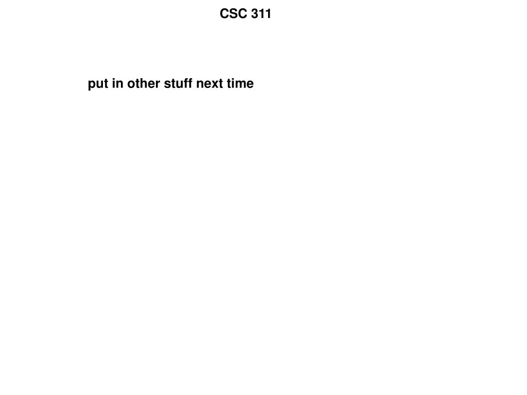 Class A: 128 possible networks, with up to 16,777,216 nodes 0nnnnnnn xxxxxxxx xxxxxxxx xxxxxxxx Class B: 16,384 possible networks with up to 65,536 nodes 10nnnnnn nnnnnnnn xxxxxxxx xxxxxxxx Class C: 2,097,152 possible networks, with up to 256 nodes 110nnnnn nnnnnnnn nnnnnnnn xxxxxxxx Class D addresses used for multicasting 1110 followed by a 28 bit multicast address Class E reserved CSC 311