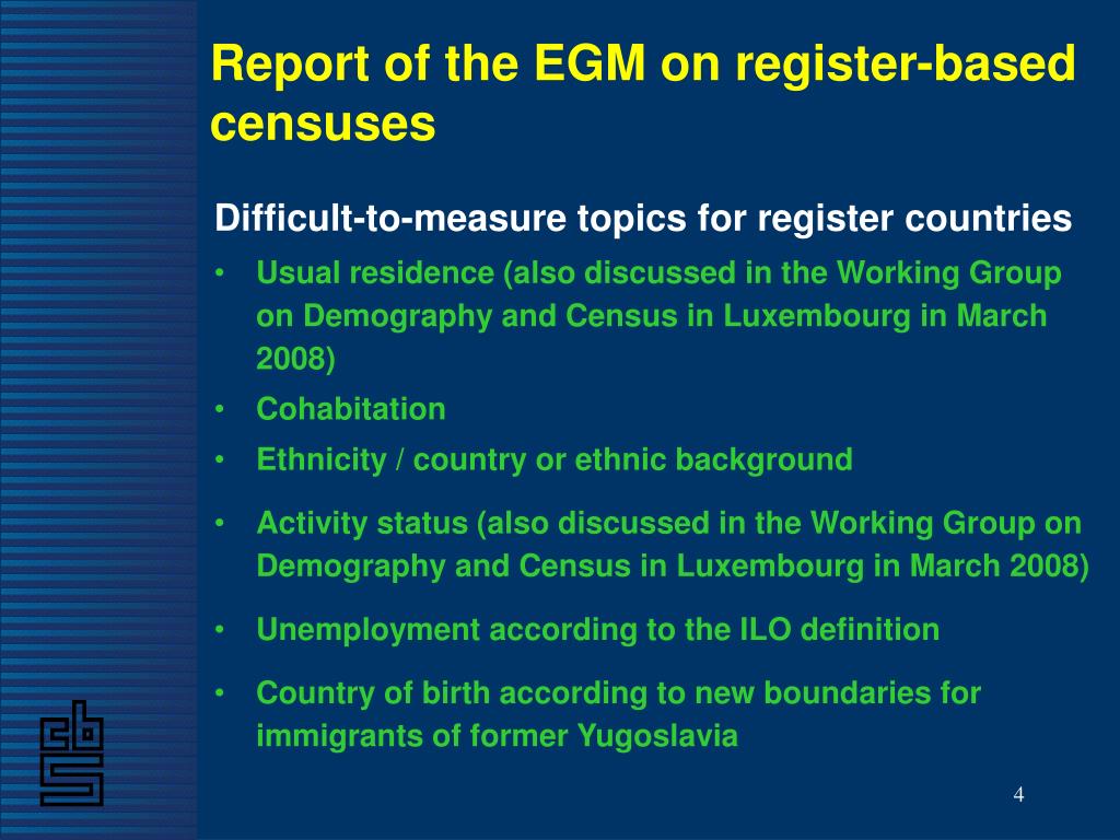 Report of the EGM on register-based censuses • Difficult-to-measure topics for register countries • Usual residence (also discussed in the Working Group on Demography and Census in Luxembourg in March 2008) • Cohabitation • Ethnicity / country or ethnic background • Activity status (also discussed in the Working Group on Demography and Census in Luxembourg in March 2008) • Unemployment according to the ILO definition • Country of birth according to new boundaries for immigrants of former Yugoslavia