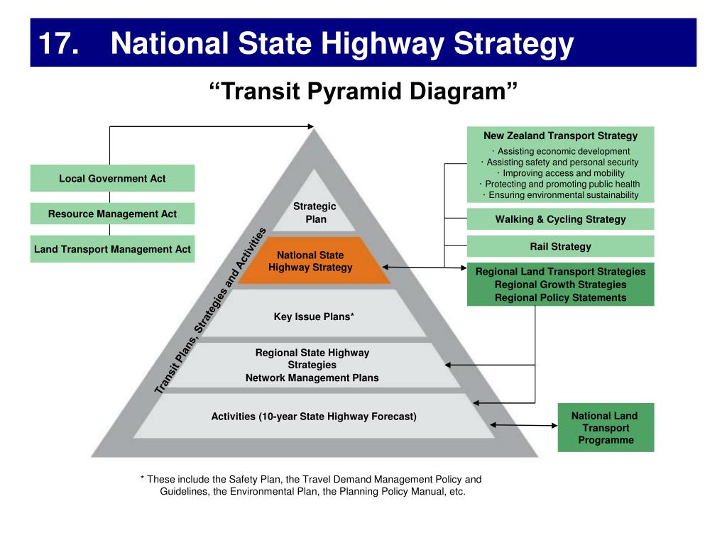 New Zealand Transport Strategy ・ Assisting economic development ・ Assisting safety and personal security ・ Improving access and mobility ・ Protecting and promoting public health ・ Ensuring environmental sustainability Local Government Act Strategic Plan Resource Management Act Walking & Cycling Strategy Land Transport Management Act Rail Strategy National State Highway Strategy Regional Land Transport Strategies Regional Growth Strategies Regional Policy Statements Transit Plans, Strategies and Activities Key Issue Plans* Regional State Highway Strategies Network Management Plans National Land TransportProgramme Activities (10-year State Highway Forecast) * These include the Safety Plan, the Travel Demand Management Policy and Guidelines, the Environmental Plan, the Planning Policy Manual, etc. 17. National State Highway Strategy “Transit Pyramid Diagram”