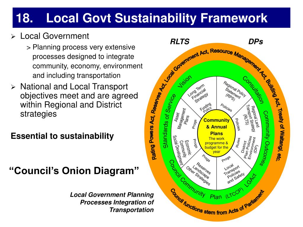 18. Local Govt Sustainability Framework • Local Government • Planning process very extensive processes designed to integrate community, economy, environment and including transportation • National and Local Transport objectives meet and are agreed within Regional and District strategies Essential to sustainability RLTS DPs “Council’s Onion Diagram” Local Government Planning Processes Integration of Transportation