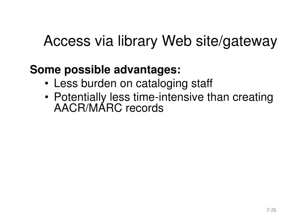 Access via library Web site/gateway Some possible advantages: • Less burden on cataloging staff • Potentially less time-intensive than creating AACR/MARC records