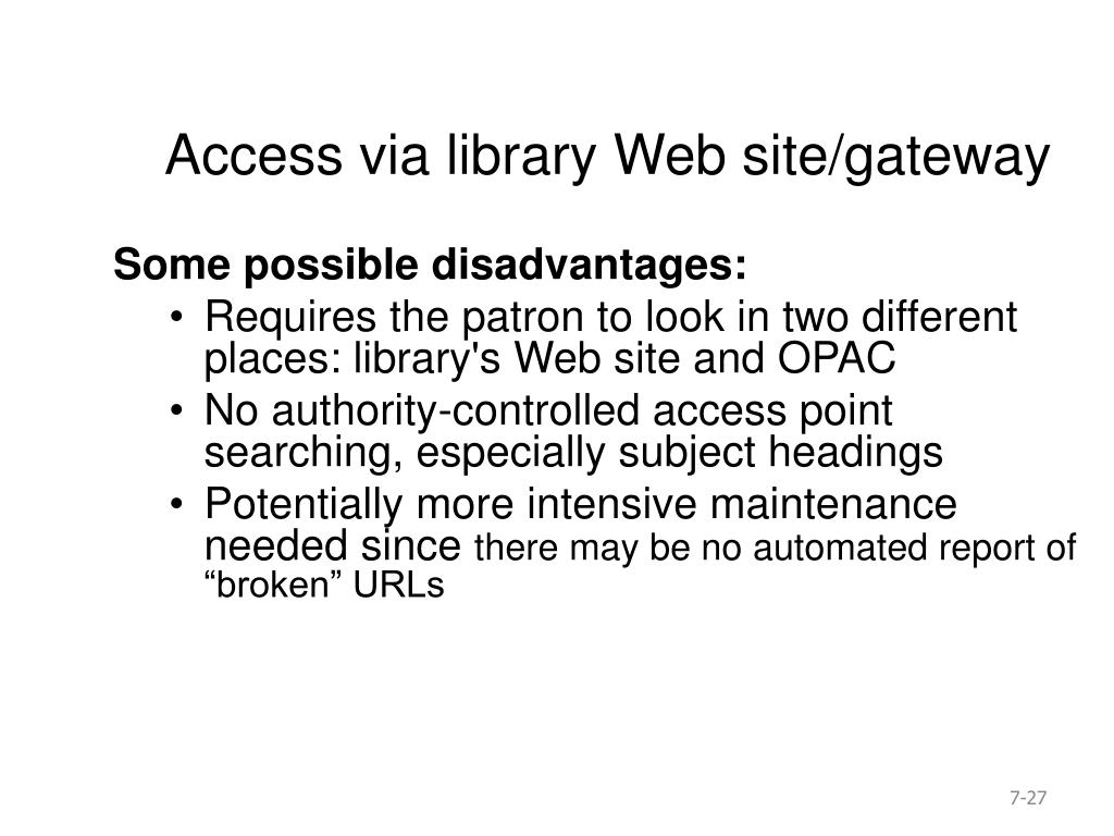 Access via library Web site/gateway Some possible disadvantages: • Requires the patron to look in two different places: library's Web site and OPAC • No authority-controlled access point searching, especially subject headings • Potentially more intensive maintenance needed since there may be no automated report of “broken” URLs