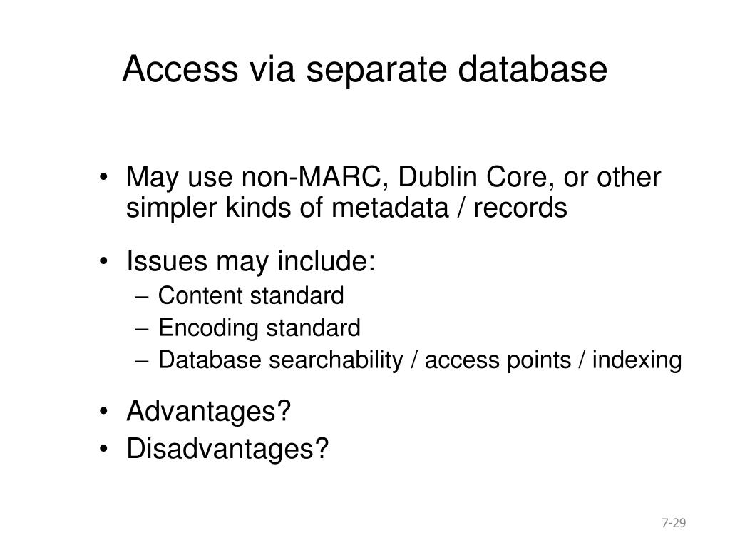 Access via separate database • May use non-MARC, Dublin Core, or other simpler kinds of metadata / records • Issues may include: • Content standard • Encoding standard • Database searchability / access points / indexing • Advantages? • Disadvantages?