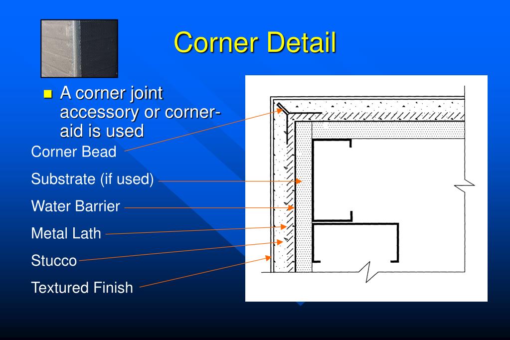 Corner Detail • A corner joint accessory or corner-aid is used Corner Bead Substrate (if used) Water Barrier Metal Lath Stucco Textured Finish