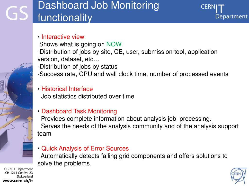 Dashboard Job Monitoring functionality • Interactive view Shows what is going on NOW. -Distribution of jobs by site, CE, user, submission tool, application version, dataset, etc… -Distribution of jobs by status -Success rate, CPU and wall clock time, number of processed events • Historical Interface Job statistics distributed over time • Dashboard Task Monitoring Provides complete information about analysis job processing. Serves the needs of the analysis community and of the analysis support team • Quick Analysis of Error Sources Automatically detects failing grid components and offers solutions to solve the problems.