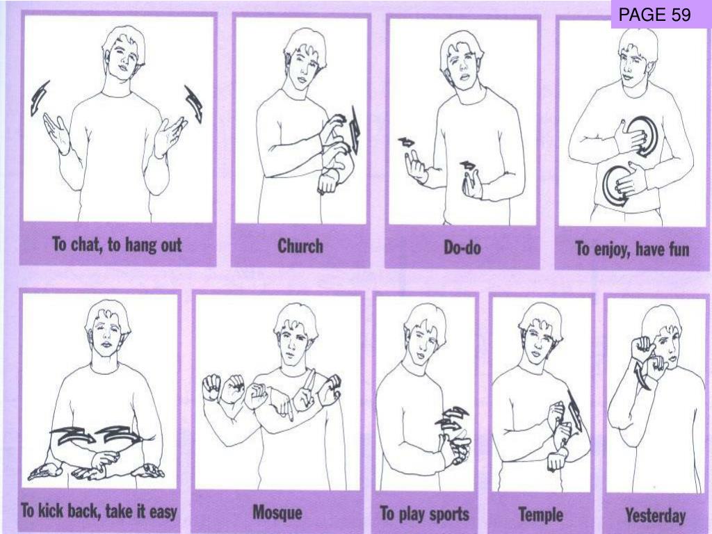 Signing About Activities • TO-CHAT, TO-HANG-OUT • CHURCH • DO-DO • TO-ENJOY, HAVE-FUN • TO-KICK-BACK, TAKE-IT-EASY • TO-PLAY-SPORTS • TEMPLE • YESTERDAY