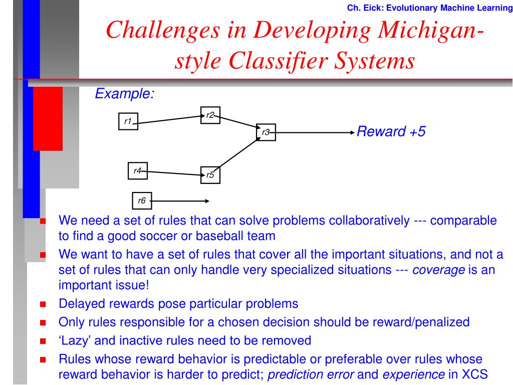 Challenges in Developing Michigan-style Classifier Systems Example: • We need a set of rules that can solve problems collaboratively --- comparable to find a good soccer or baseball team • We want to have a set of rules that cover all the important situations, and not a set of rules that can only handle very specialized situations --- coverage is an important issue! • Delayed rewards pose particular problems • Only rules responsible for a chosen decision should be reward/penalized • ‘Lazy’ and inactive rules need to be removed • Rules whose reward behavior is predictable or preferable over rules whose reward behavior is harder to predict; prediction error and experience in XCS r2 r1 Reward +5 r3 r4 r5 r6