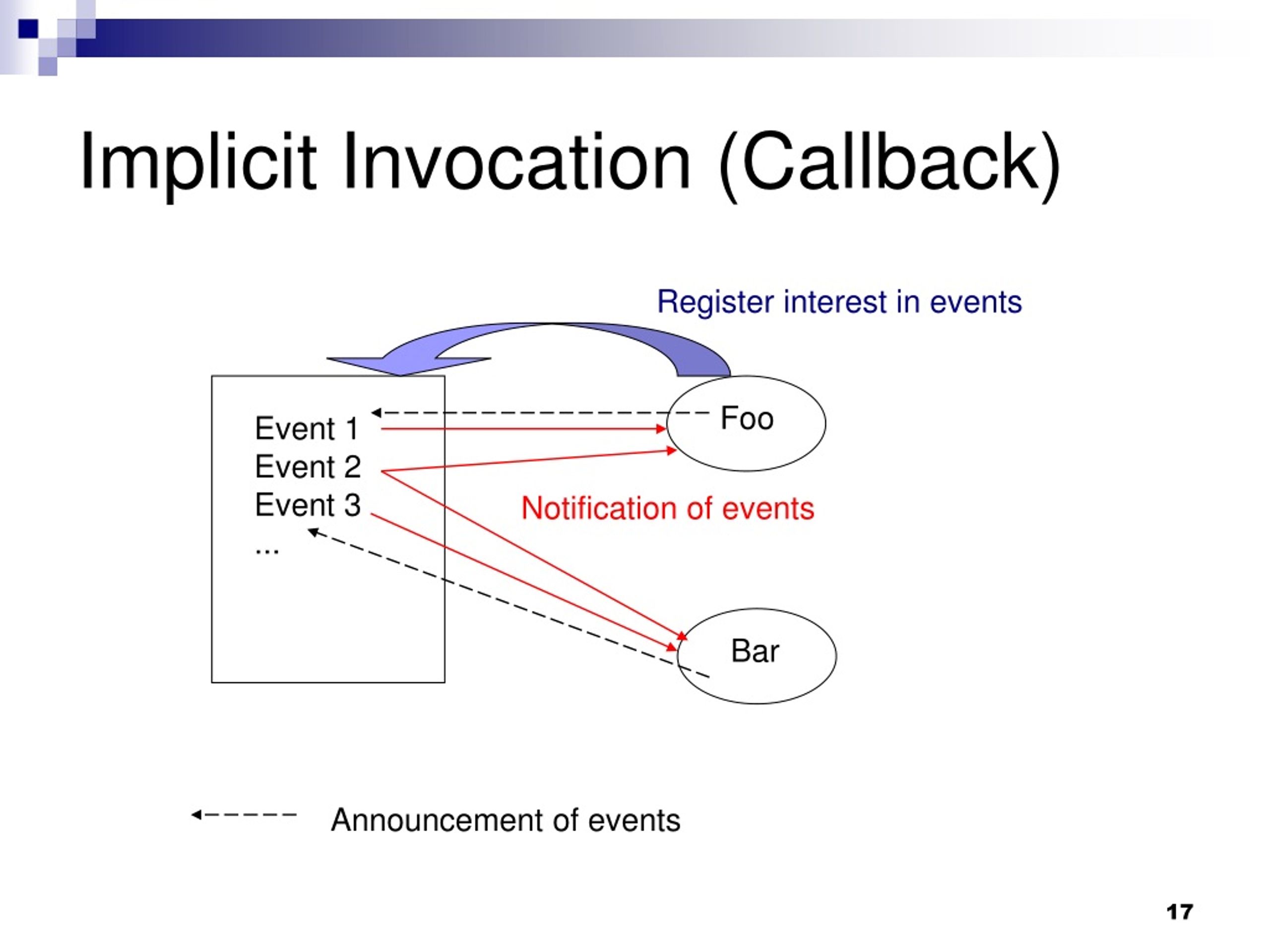 Register interest in events Foo Bar Event 1 Event 2 Event 3 ... Notification of events Implicit Invocation (Callback) Announcement of events