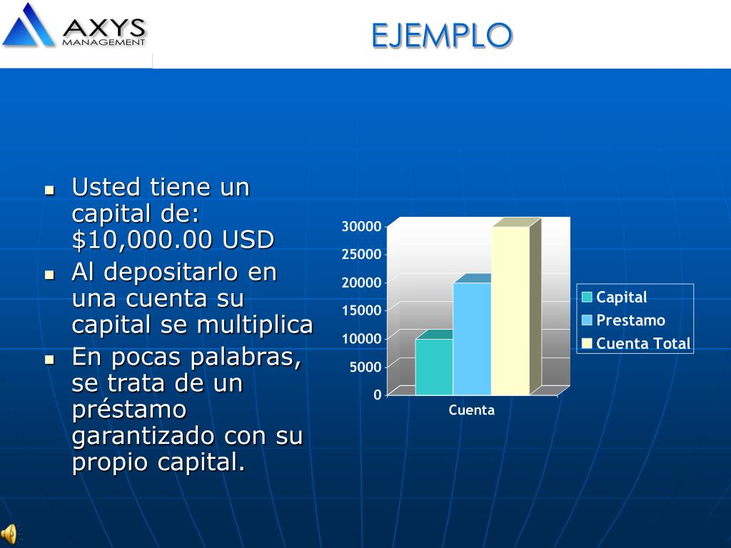 EJEMPLO • Usted tiene un capital de: $10,000.00 USD • Al depositarlo en una cuenta su capital se multiplica • En pocas palabras, se trata de un préstamo garantizado con su propio capital.