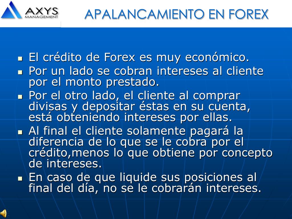 APALANCAMIENTO EN FOREX • El crédito de Forex es muy económico. • Por un lado se cobran intereses al cliente por el monto prestado. • Por el otro lado, el cliente al comprar divisas y depositar éstas en su cuenta, está obteniendo intereses por ellas. • Al final el cliente solamente pagará la diferencia de lo que se le cobra por el crédito,menos lo que obtiene por concepto de intereses. • En caso de que liquide sus posiciones al final del día, no se le cobrarán intereses.