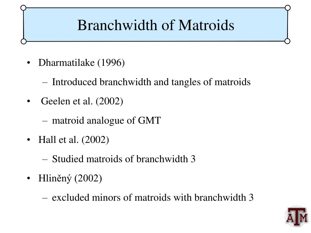 Branchwidth of Matroids • Dharmatilake (1996) • Introduced branchwidth and tangles of matroids • Geelen et al. (2002) • matroid analogue of GMT • Hall et al. (2002) • Studied matroids of branchwidth 3 • Hliněný (2002) • excluded minors of matroids with branchwidth 3