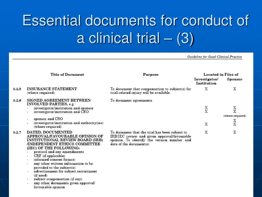 Essential documents for conduct of a clinical trial –(1) • Before starting trial - 20 • During clinical conduct - 25 • After completion/termination - 8