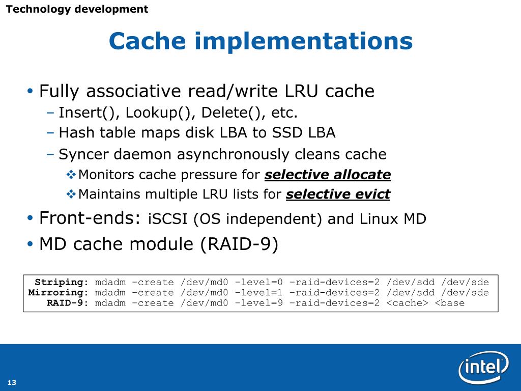 Technology development Cache implementations • Fully associative read/write LRU cache • Insert(), Lookup(), Delete(), etc. • Hash table maps disk LBA to SSD LBA • Syncer daemon asynchronously cleans cache • Monitors cache pressure for selective allocate • Maintains multiple LRU lists for selective evict • Front-ends: iSCSI (OS independent) and Linux MD • MD cache module (RAID-9) Striping: mdadm –create /dev/md0 –level=0 –raid-devices=2 /dev/sdd /dev/sde Mirroring: mdadm –create /dev/md0 –level=1 –raid-devices=2 /dev/sdd /dev/sde RAID-9: mdadm –create /dev/md0 –level=9 –raid-devices=2 <cache> <base